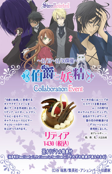 11/15~11/30の期間中、谷 瑞恵先生のアイデアを元に作成したオリジナルスイーツを「執事喫茶 Swallowtail」・「Patisserie Swallowtail」にてご提供致します。